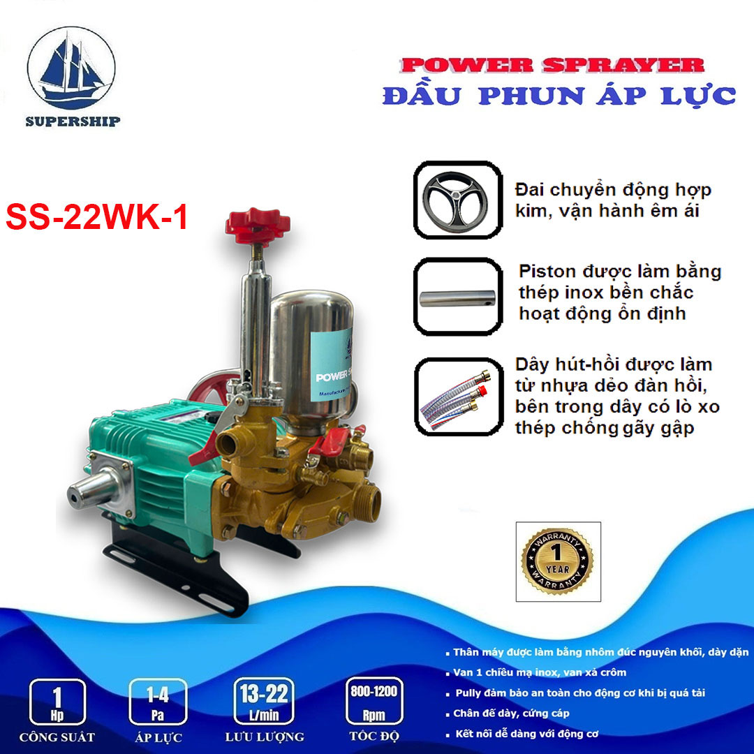 Đầu phun áp lực SUPER SHIP SS-22WK-1 là sản phẩm mới của Công ty VĨ CƯỜNG được sản xuất tại Trung Quốc theo công nghệ mới. Với bình tích áp sử dụng chất liệu inox, Van 1 chiều (Luppe) inox được lắp ở đầu ống hút có chức năng giữ nước mồi, ngăn nước chảy ngược khi Đầu phun áp lực kết nối máy bơm ngừng hoạt động, giúp máy bơm hoạt động ổn định, đồng thời hoạt động với tốc độ cao mang lại hiệu suất làm việc mạnh mẽ hơn và áp lực nước lớn hơn. Giúp bạn dễ dàng xử lý mọi vết bám bẩn trên xe hoặc tường, sân, vườn, v.v. Sản phẩm có nhiều ưu điểm và tính năng vượt trội, mang lại nhiều lợi ích và tiện lợi khi sử dụng.