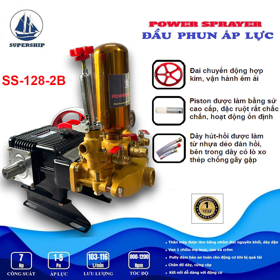 Đầu phun áp lực SUPER SHIP SS-128-2B là sản phẩm mới của Công ty VĨ CƯỜNG được sản xuất tại Trung Quốc theo công nghệ mới. Với bình tích áp sử dụng chất liệu inox, Van 1 chiều (Luppe) inox được lắp ở đầu ống hút có chức năng giữ nước mồi, ngăn nước chảy ngược khi máy bơm ngừng hoạt động, giúp máy bơm hoạt động ổn định, đồng thời hoạt động với tốc độ cao mang lại hiệu suất làm việc mạnh mẽ hơn và áp lực nước lớn hơn. Giúp bạn dễ dàng xử lý mọi vết bám bẩn trên xe hoặc tường, sân, vườn, v.v. Sản phẩm có nhiều ưu điểm và tính năng vượt trội, mang lại nhiều lợi ích và tiện lợi khi sử dụng.