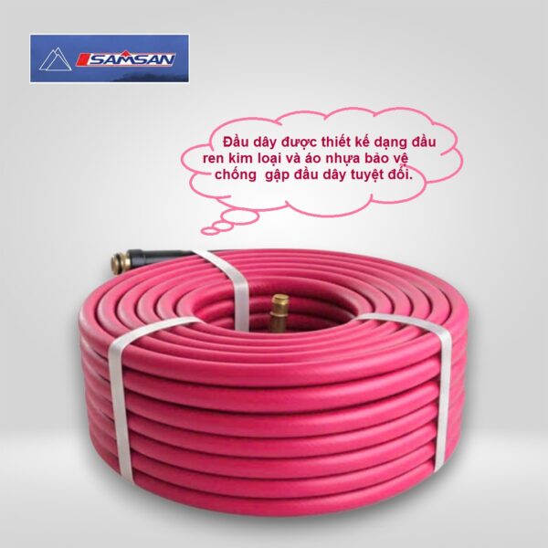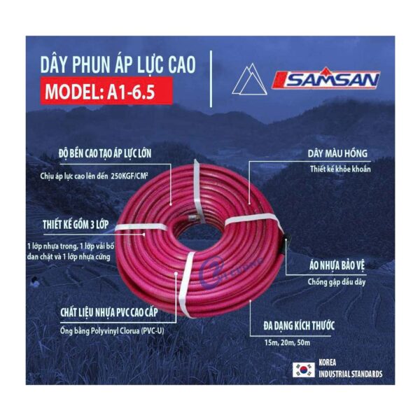 + Dây phun áp lực cao SAMSAN, model A1-6.5mm*50m được làm bằng chất liệu Polyvinyl Clorua (PVC-U) dùng cho hệ thống cấp thoát chất lỏng trong điều kiện có áp suất cao.