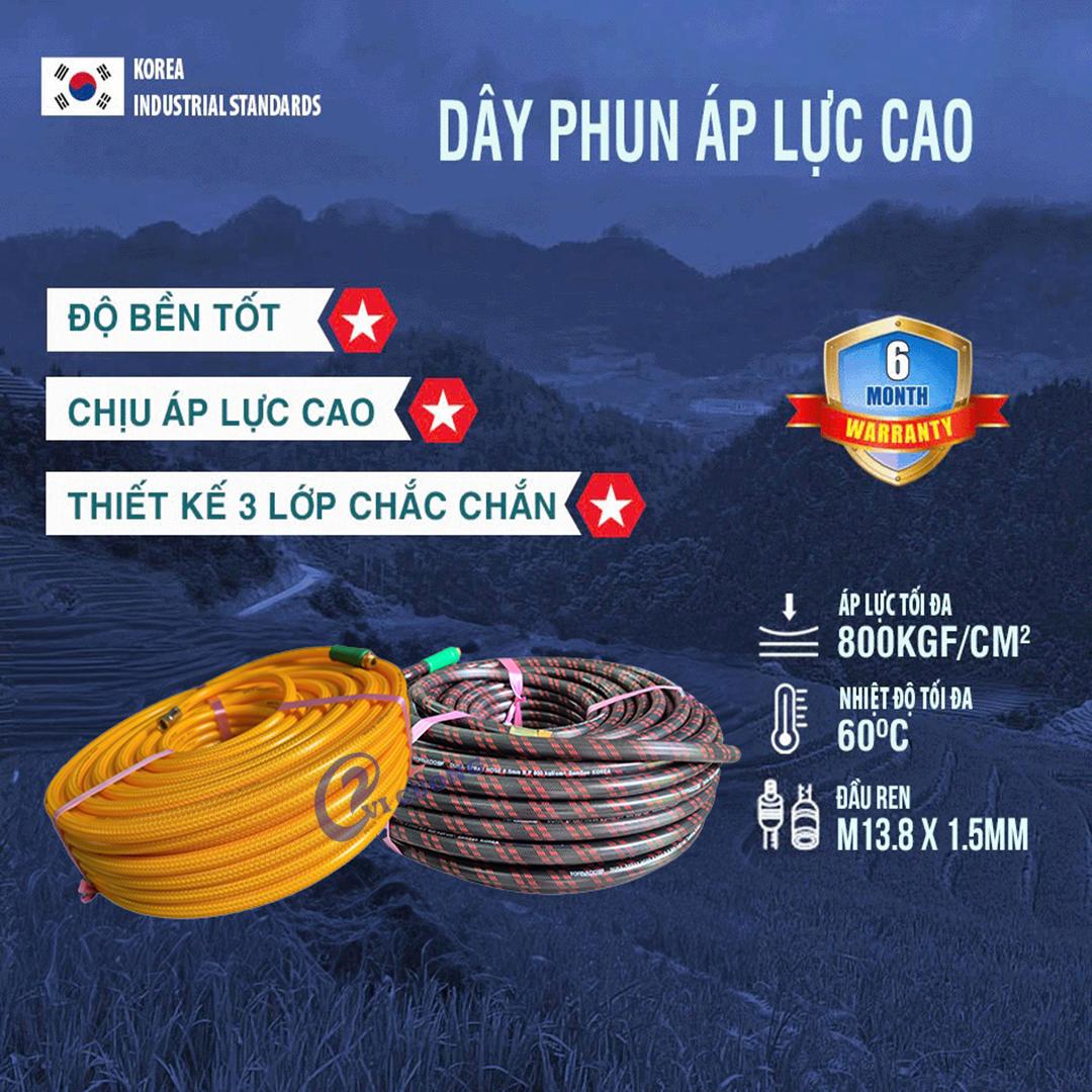 Dây được sản xuất tại nhà máy Trung Quốc theo tiêu chuẩn công nghệ Hàn Quốc, thiết kế có độ bền cao, chịu được áp lực và dẫn áp tốt.