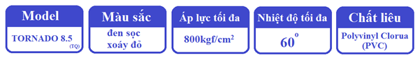 • Dây phun áp lực cao Tornado(TQ) được thiết kế từ nhựa PVC gồm 3 lớp: lớp nhựa cứng bên ngoài, lớp nhựa dẻo bên trong và lớp vải bố được đan cực kỳ chặt ở giữa. Với thiết kế 3 lớp cực chắc chắn như vậy, dây phun áp lực cao Tornado(TQ) có thể chịu được áp lực lên tới 800kgf/cm2 và nhiệt độ tới 60oC.