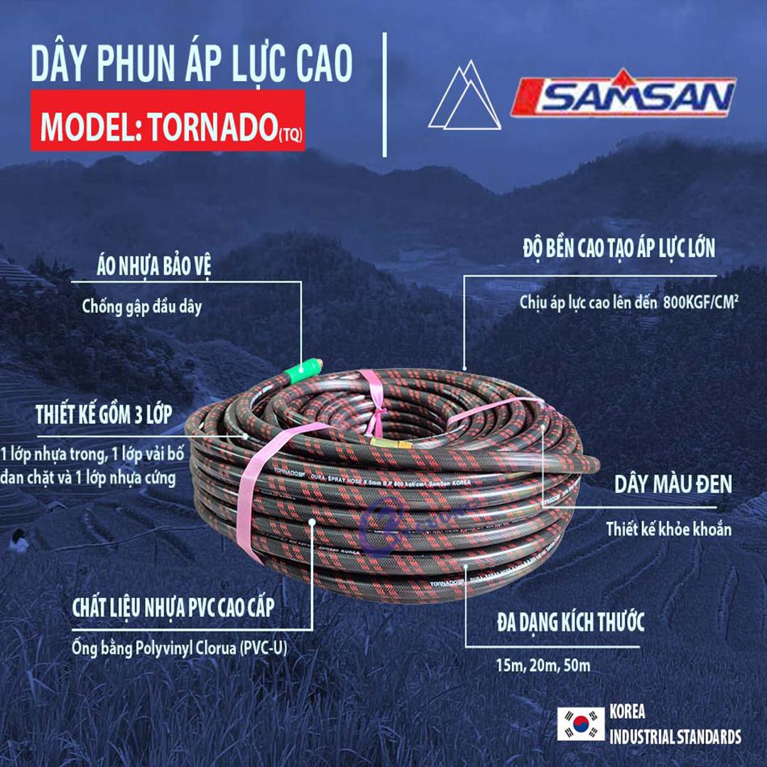 + Dây phun áp lực cao SAMSAN, model Tornado (TQ) 8.5mm*50m được làm bằng chất liệu Polyvinyl Clorua (PVC-U) dùng cho hệ thống cấp thoát chất lỏng trong điều kiện có áp suất cao.